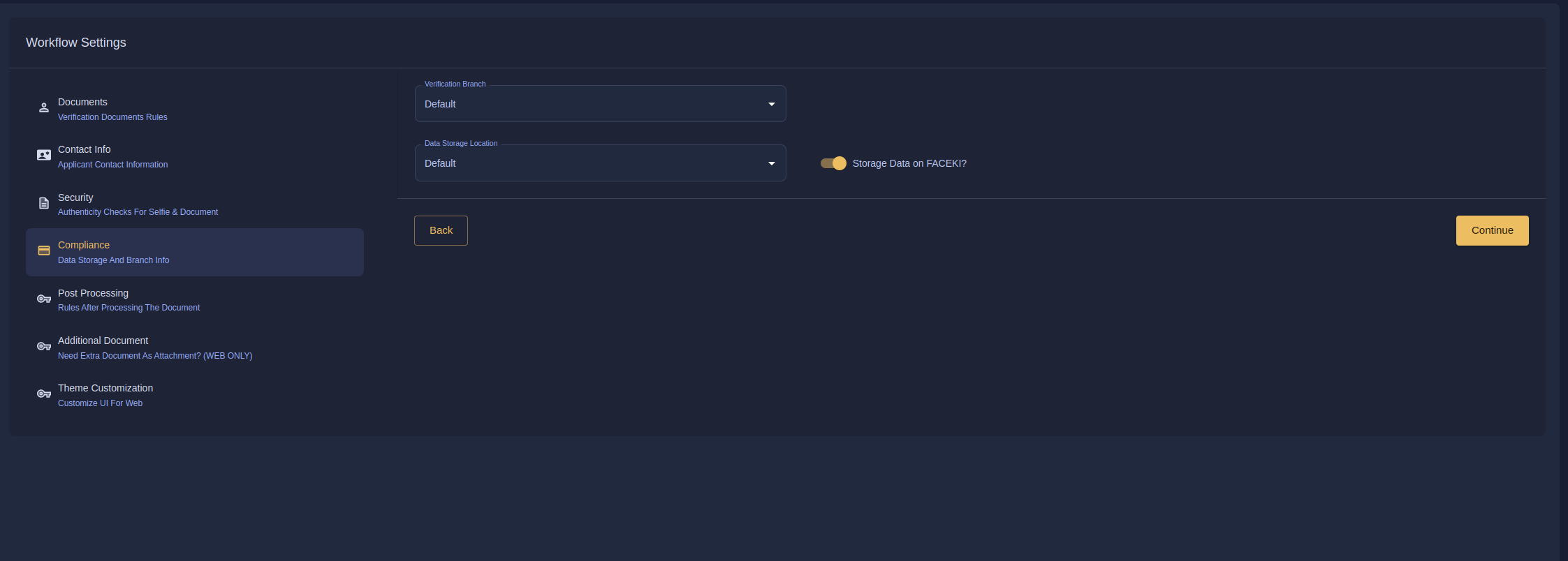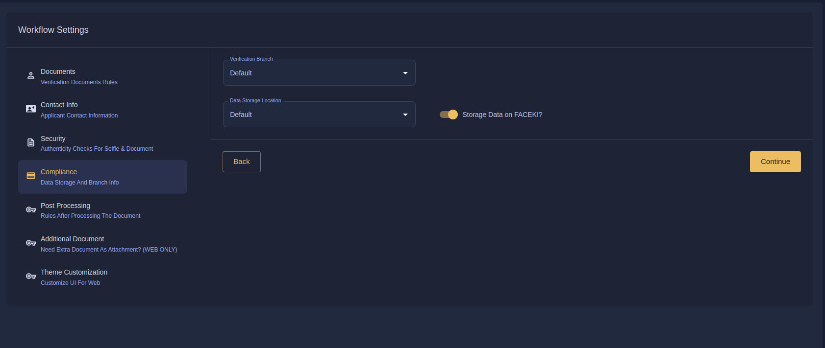 From the [FACEKI dashboard](https://intelligence.faceki.com/customer/integrations/workflow-manage), navigate to **Workflows**. Here, you can create and configure the verification workflows.&#x20;