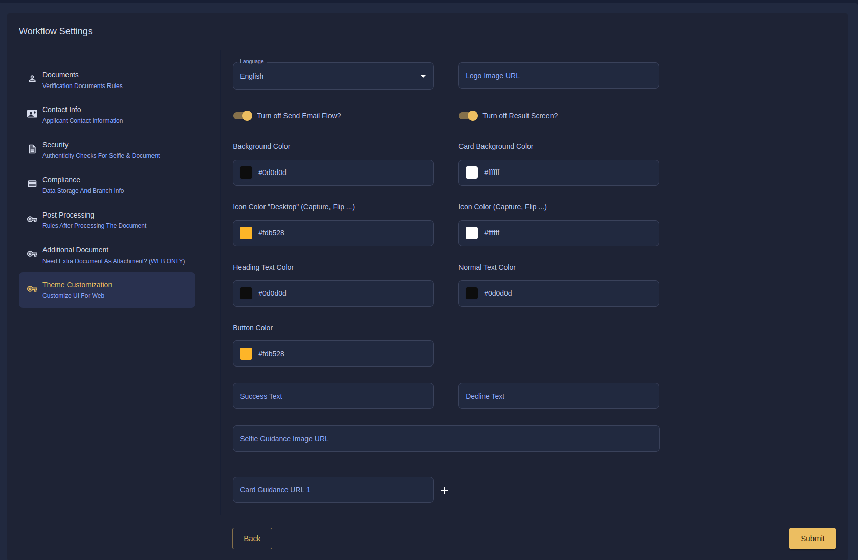 * **Button Color**: Specify the color for buttons in the workflow.